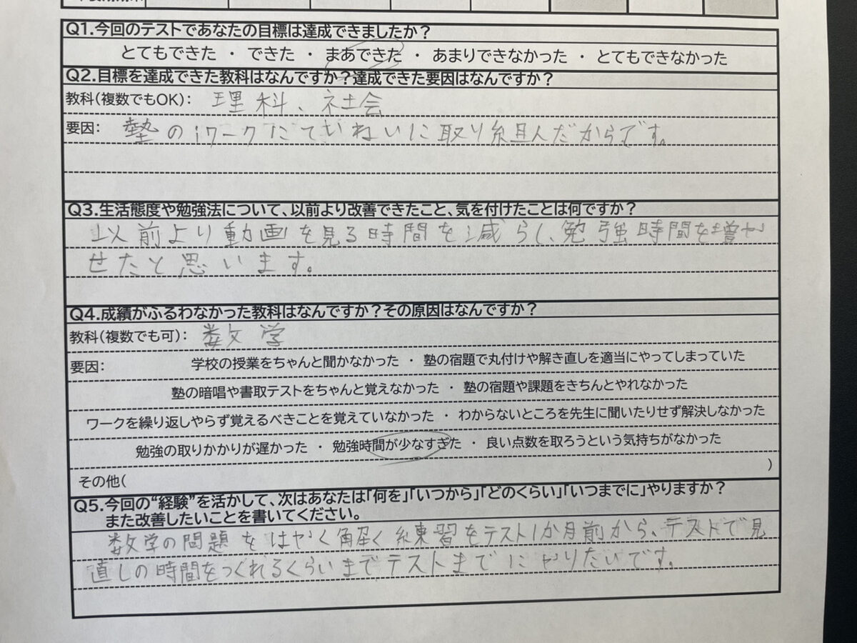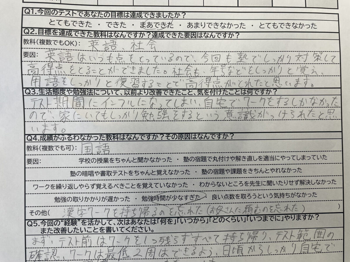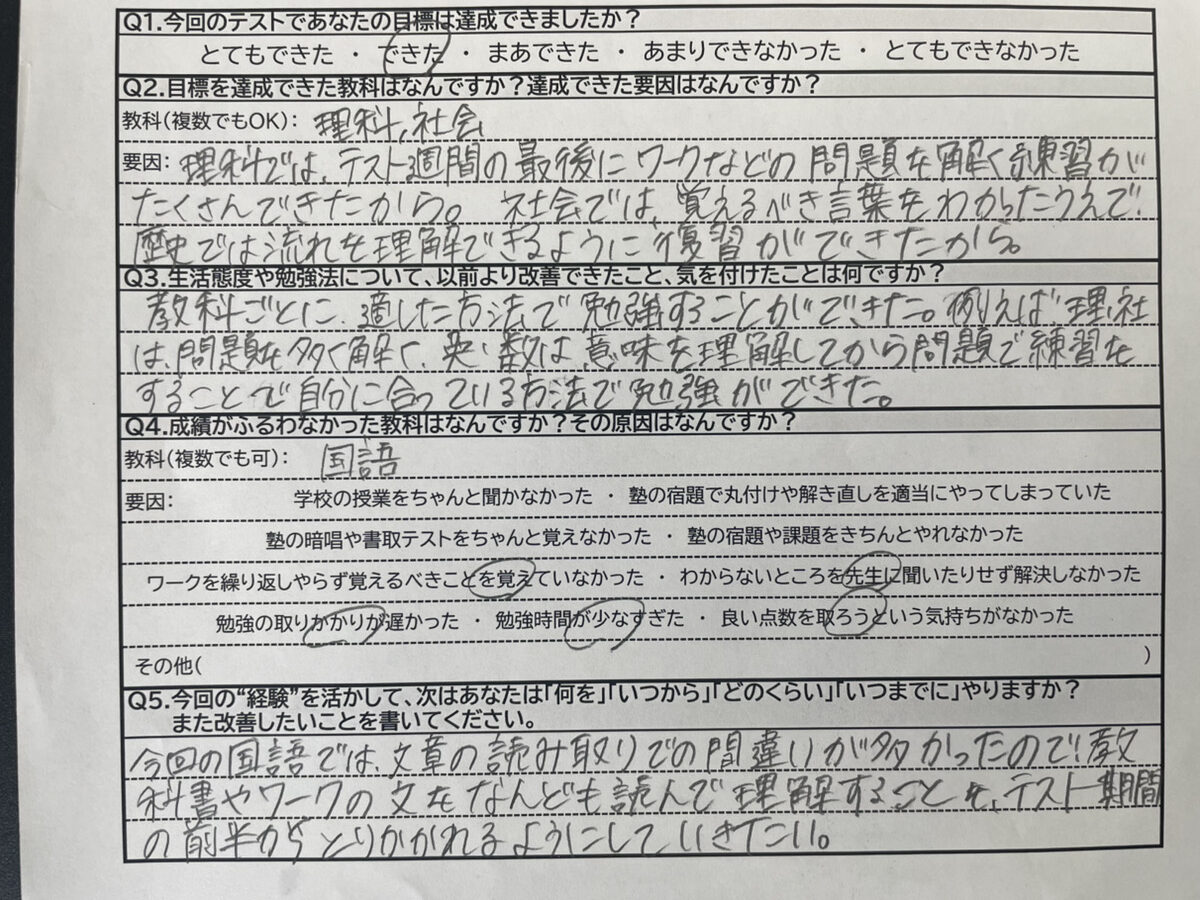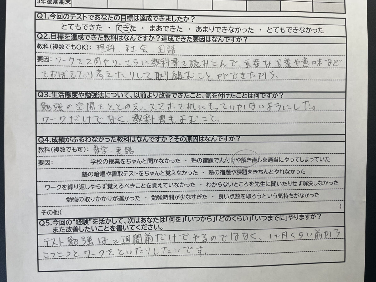 (理科・社会・国語)ワークを2周し教科書を読み込んで重要な言葉や意味などを覚えたり考えたりして取り組むことができたから