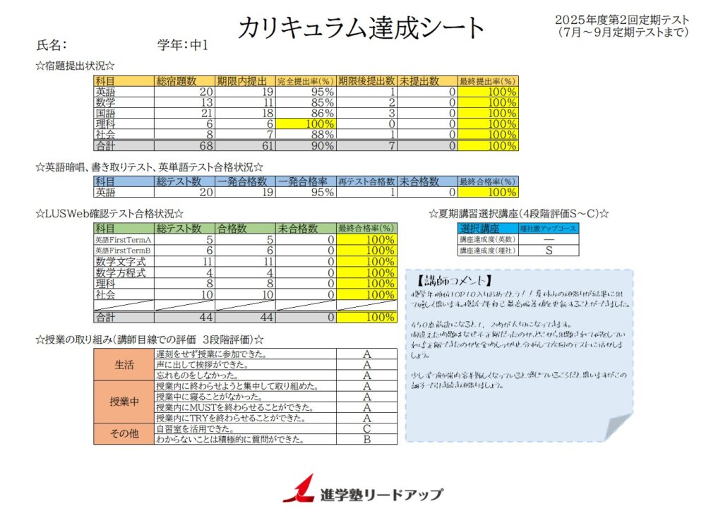 リードアップでは中1,2生は年に4回定期テスト終了のタイミングでカリキュラム達成表をもとに塾での進捗や授業の取り組みの様子を保護者様にもフィードバックさせていただいています。